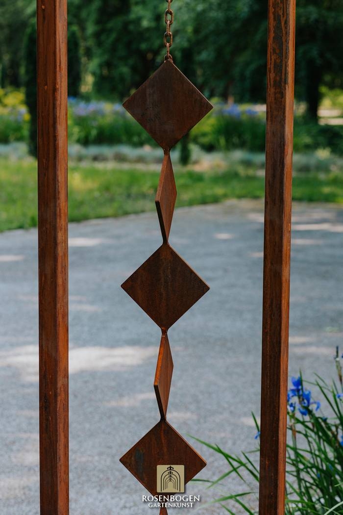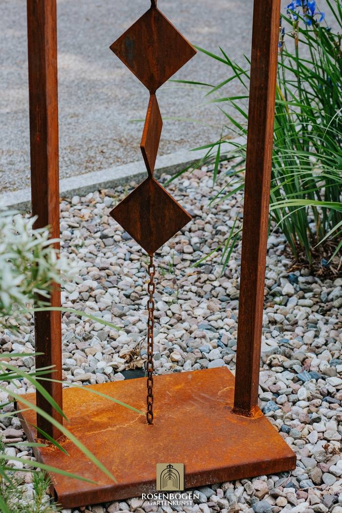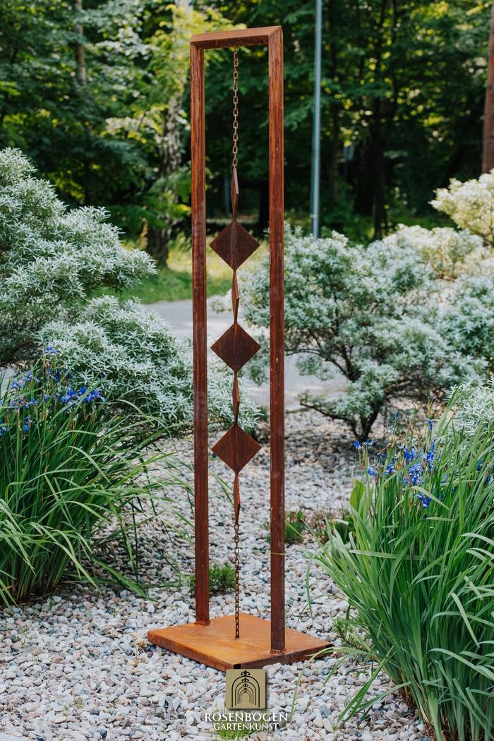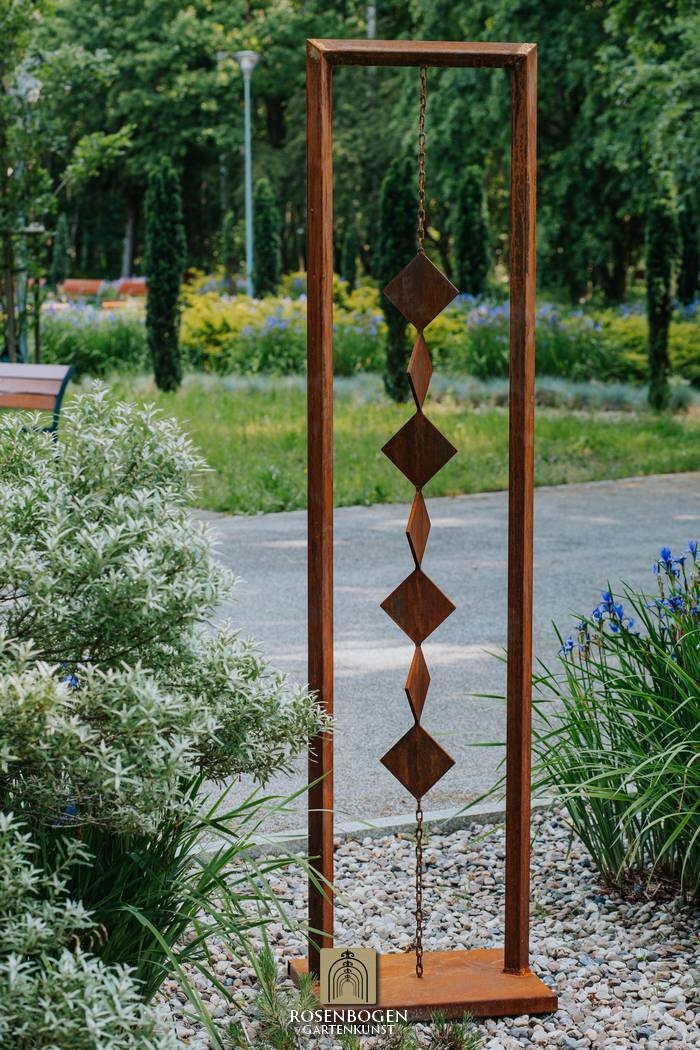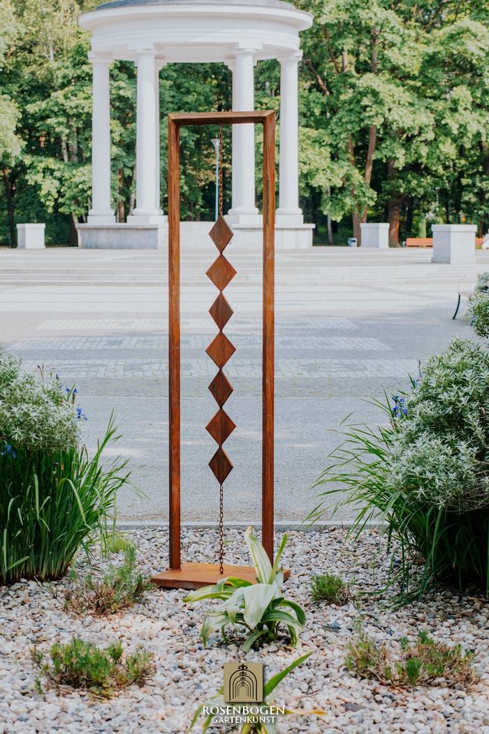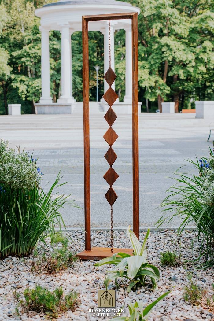 The steel frame made of 40x40 mm profile is firmly anchored to a base plate and supports a vertical chain with precisely arranged, diamond-shaped elements. These move gently in the wind and lend the otherwise strict form a poetic lightness. The object weighs 20 kg and stands securely on any flat surface