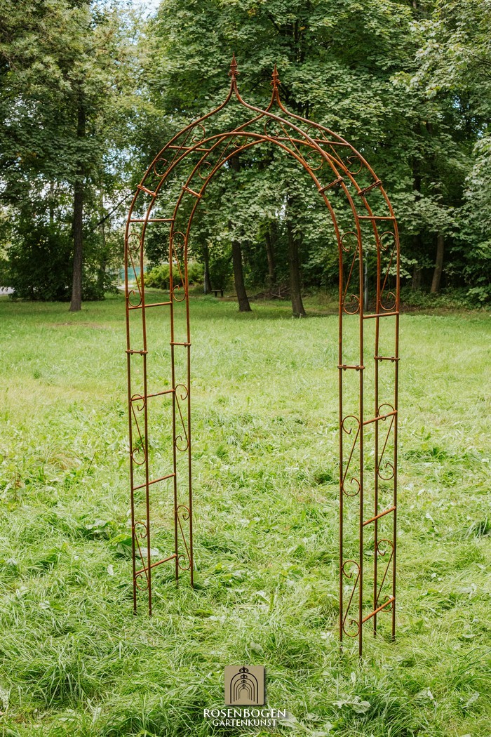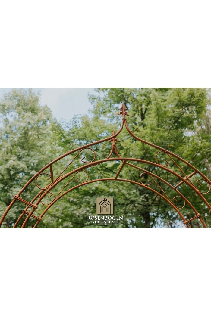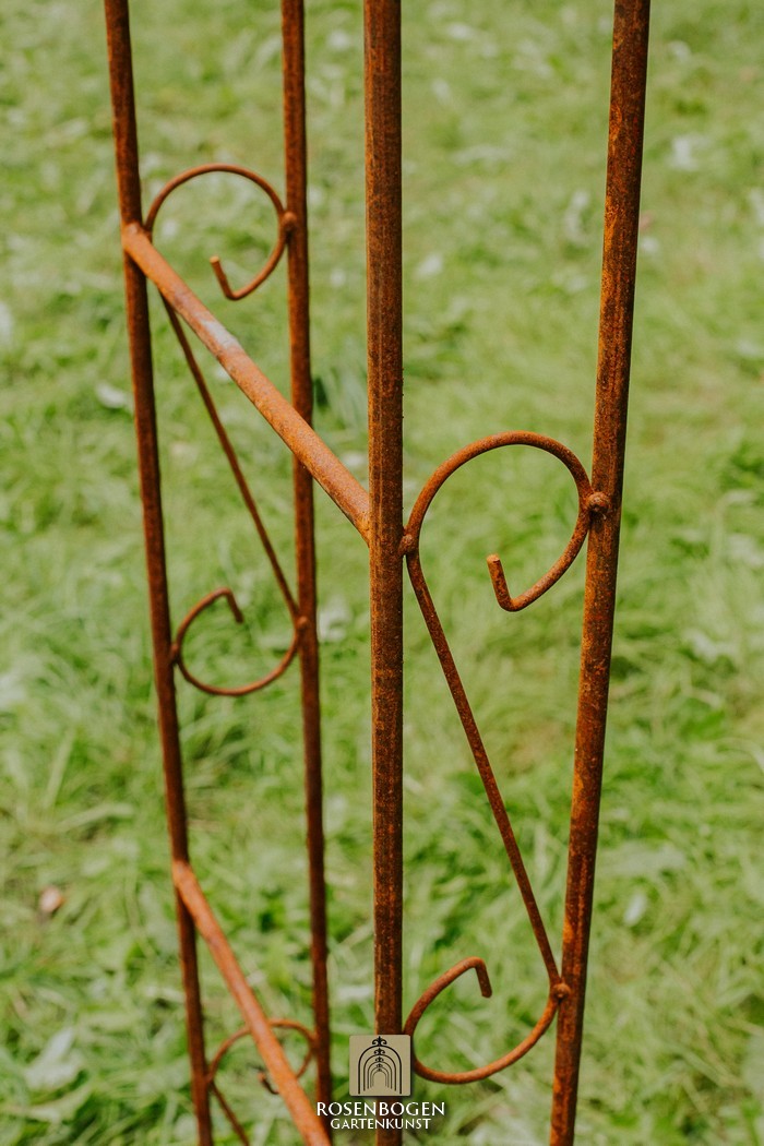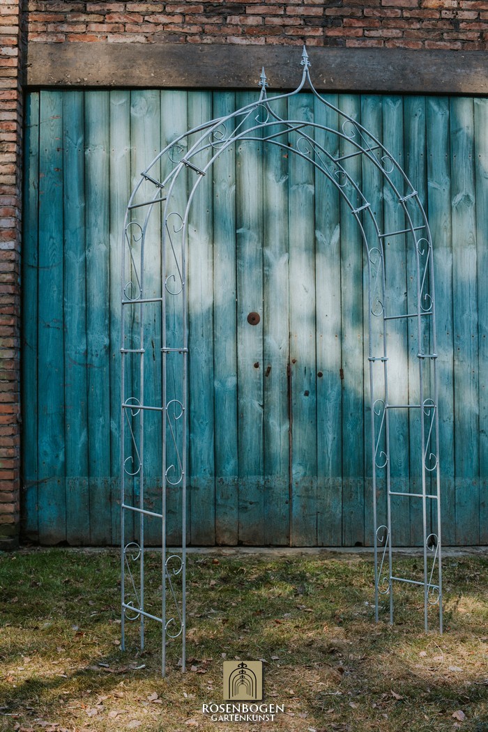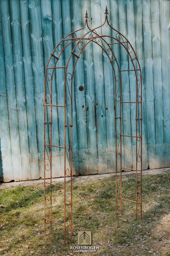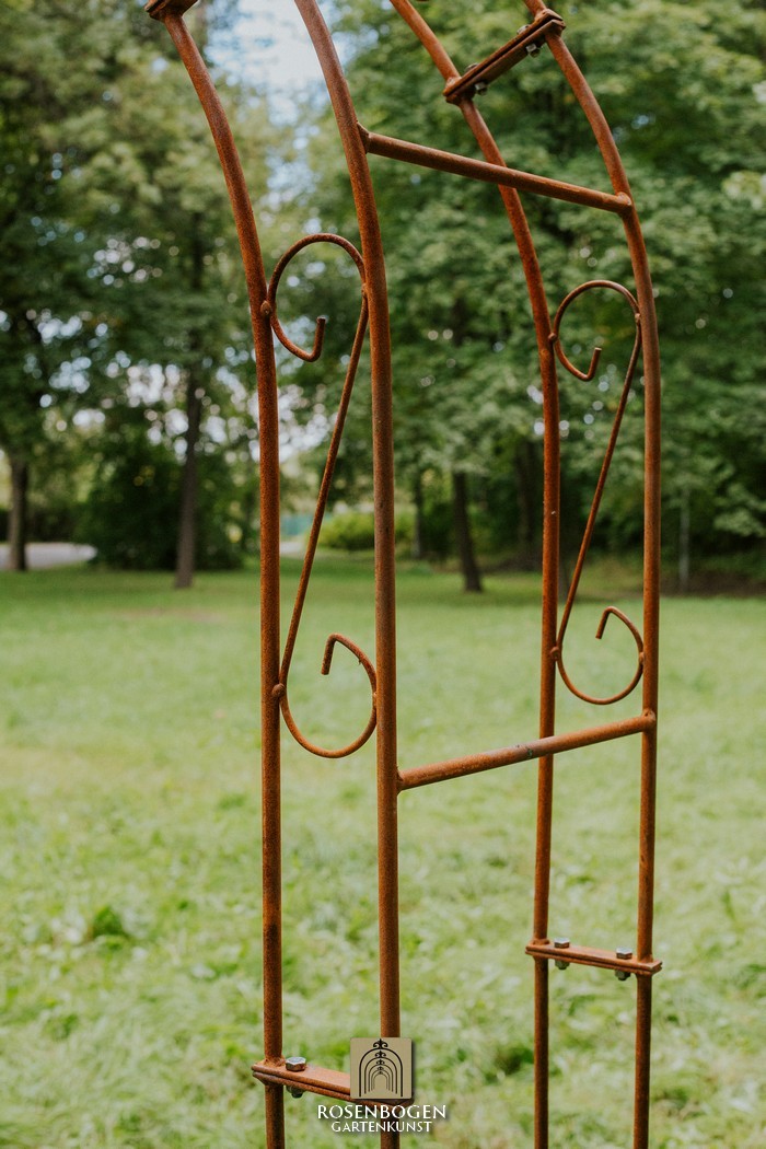 The Garden arch ALEX made of solid ferrous metal gives front gardens a beautiful look. We offer the Garden arch in a rust-look, black or galvanised version. This beautiful and stable garden arch made of high-quality metal is the perfect climbing aid for all climbing plants, such as roses and other climbing flowers. The height of the garden arch is sufficient for everyone and has been handcrafted in true style. The bold ornamentation and stylish design guarantee many design options. Placed free-standing, the garden arch provides a stable place for ornamental plants as well as crops such as grapes. It also serves as a highly decorative garden element without plants and can be used wonderfully as a privacy screen and statue