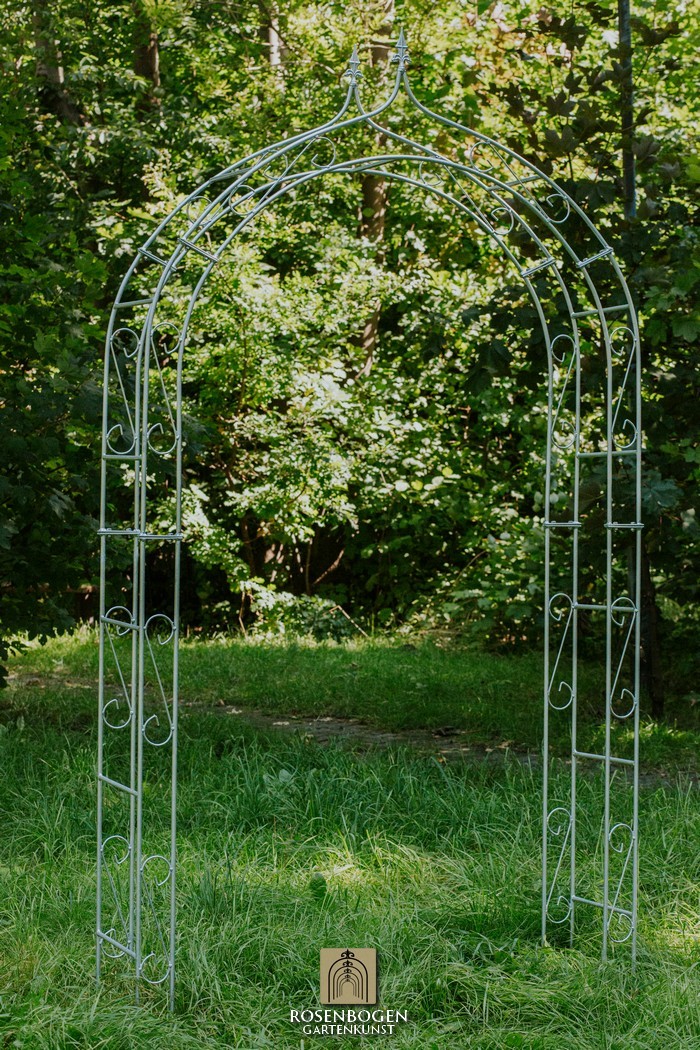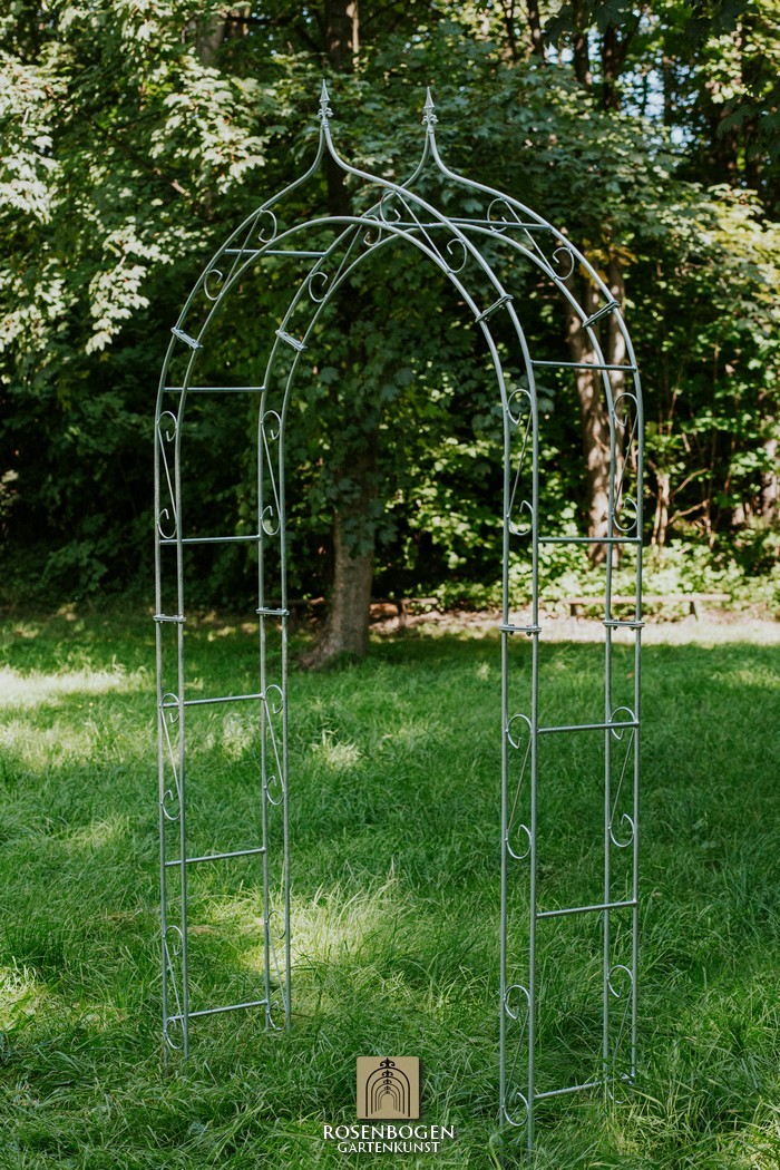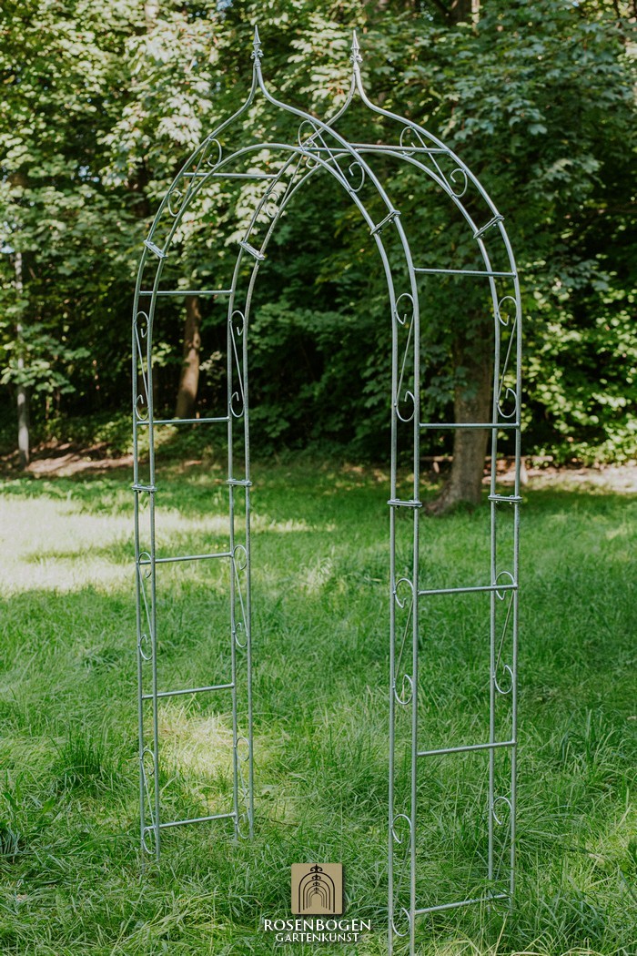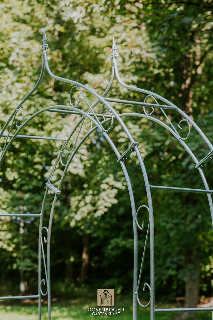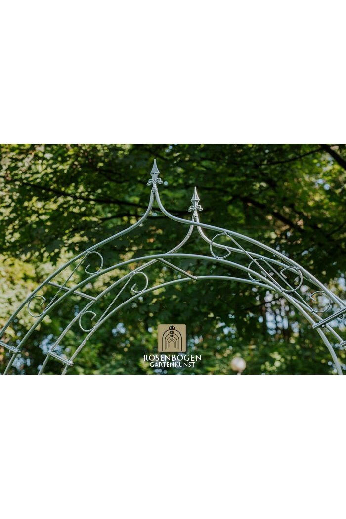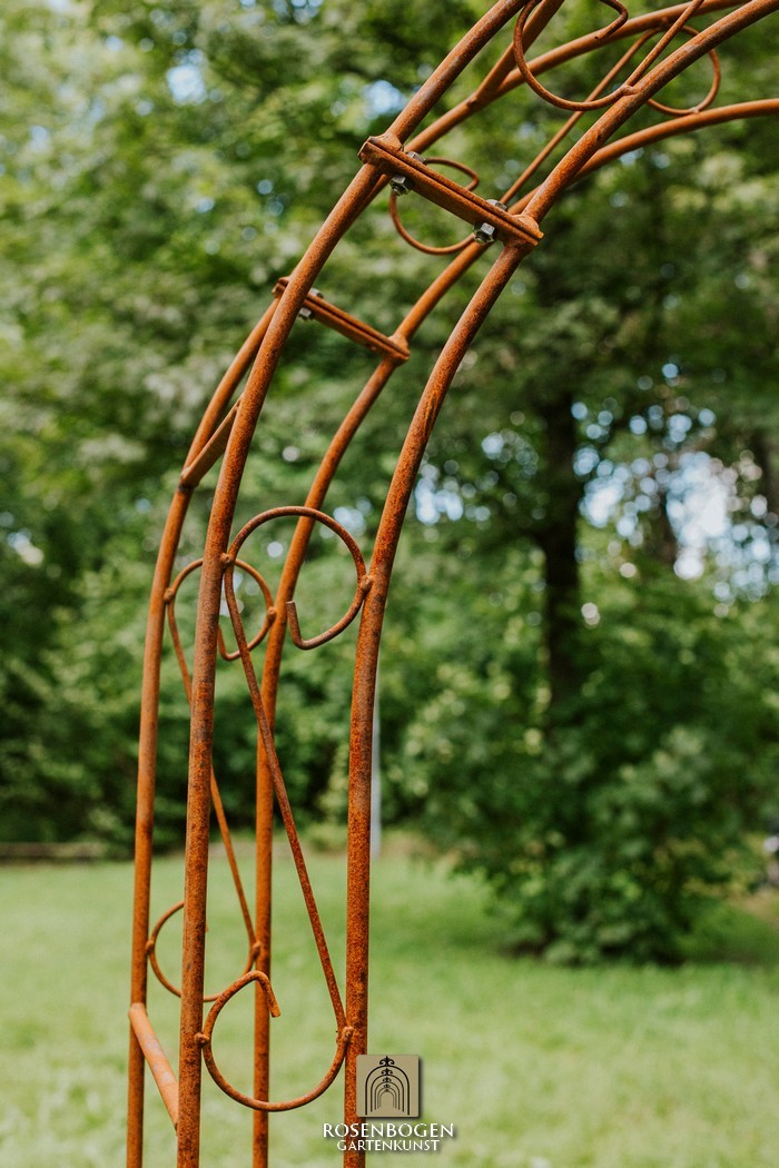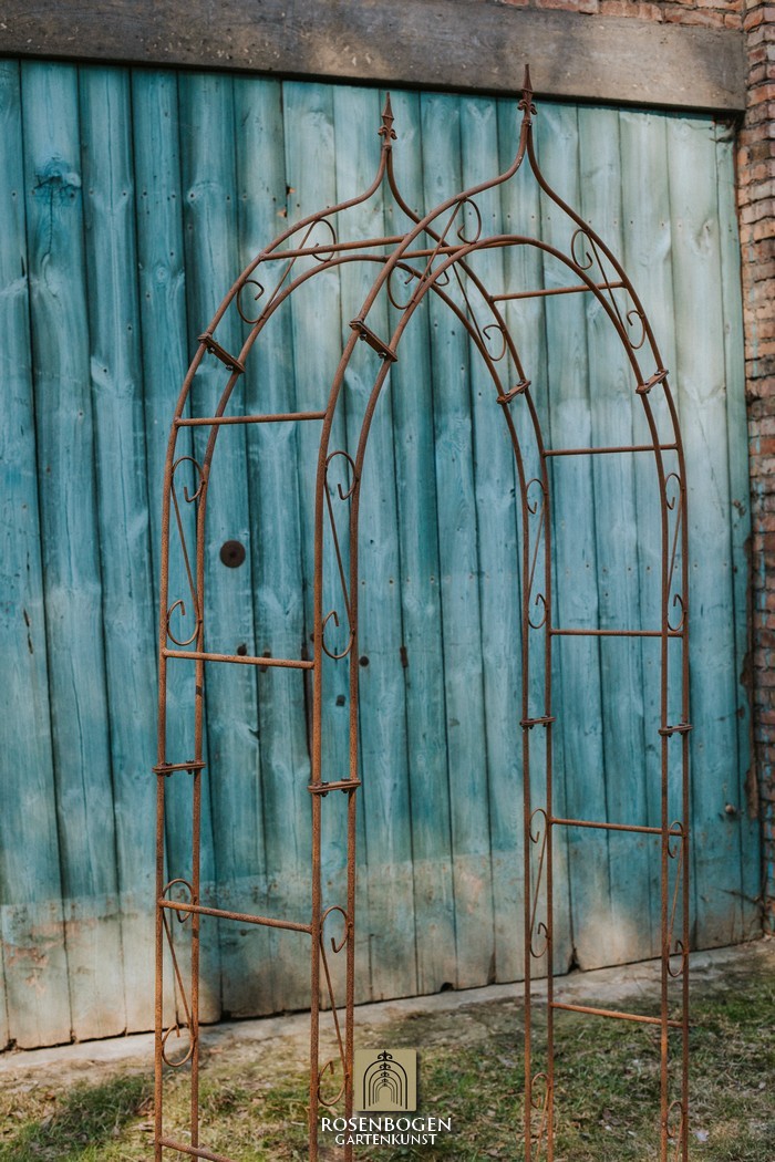The Garden arch ALEX made of solid ferrous metal gives front gardens a beautiful look. We offer the Garden arch in a rust-look, black or galvanised version. This beautiful and stable garden arch made of high-quality metal is the perfect climbing aid for all climbing plants, such as roses and other climbing flowers. The height of the garden arch is sufficient for everyone and has been handcrafted in true style. The bold ornamentation and stylish design guarantee many design options. Placed free-standing, the garden arch provides a stable place for ornamental plants as well as crops such as grapes. It also serves as a highly decorative garden element without plants and can be used wonderfully as a privacy screen and statue