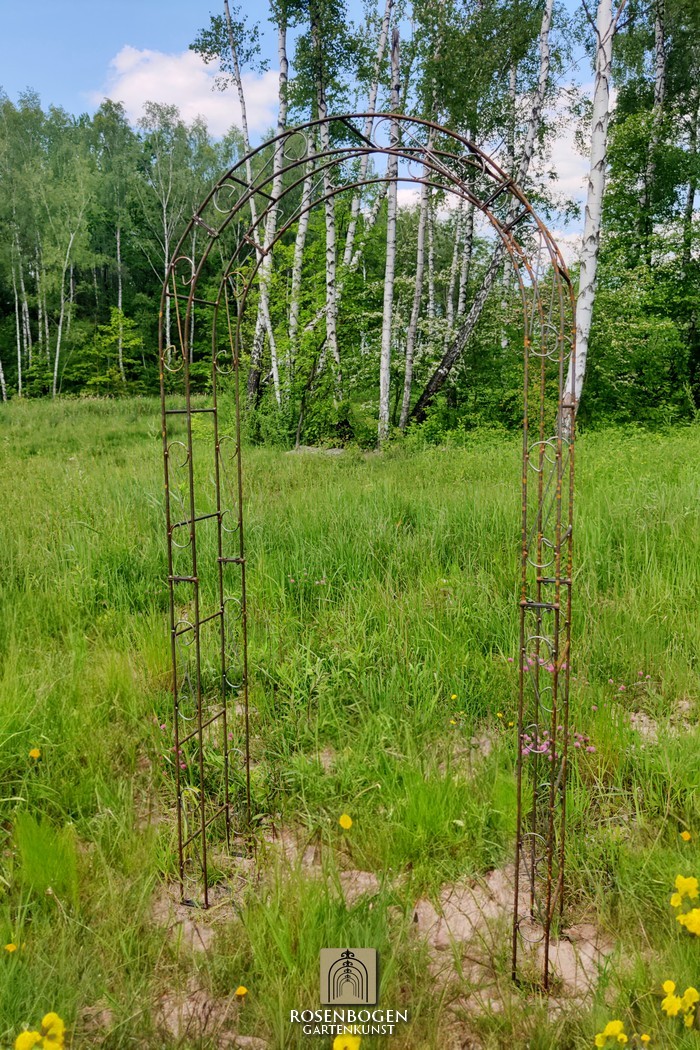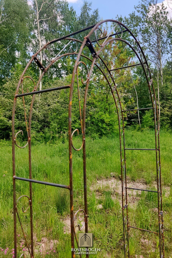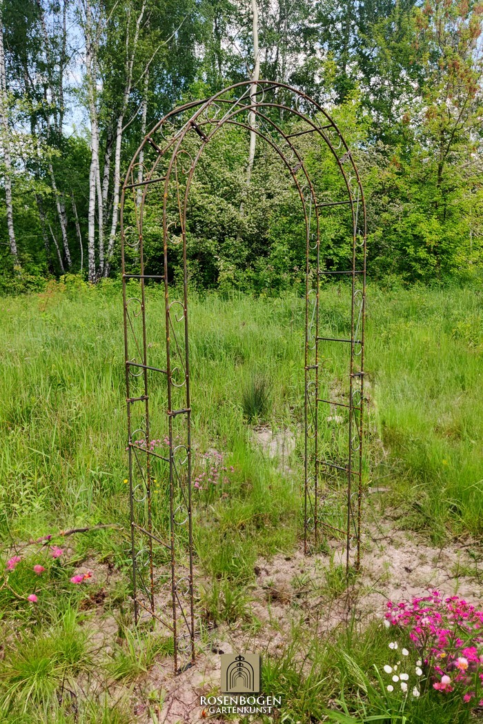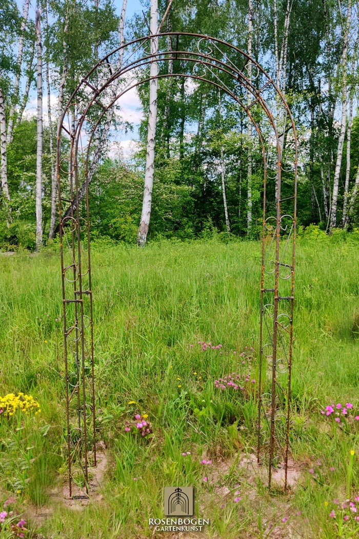 The Garden arch ALEX round made of solid ferrous metal gives front gardens a beautiful look. We offer the Garden arch in a rust-look, black or galvanised version. This beautiful and stable garden arch made of high-quality metal is the perfect climbing aid for all climbing plants, such as roses and other climbing flowers. The height of the garden arch is sufficient for everyone and has been handcrafted in true style. The bold ornamentation and stylish design guarantee many design options. Placed free-standing, the garden arch provides a stable place for ornamental plants as well as crops such as grapes. It also serves as a highly decorative garden element without plants and can be used wonderfully as a privacy screen and statue