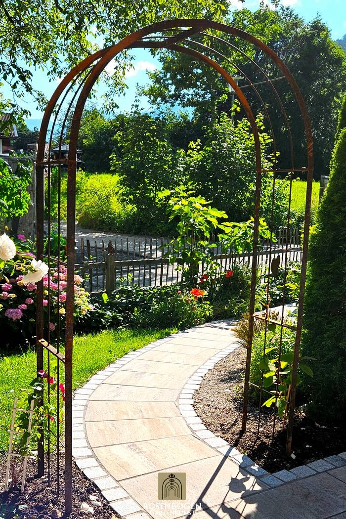 The Garden arch EMMA is made of solid iron. We offer the Garden arch in a rust-look, galvanised or black version. This simple version of the Garden arch MIA is a sturdy metal Garden arch made of high-quality metal and is also the perfect climbing aid for all climbing plants such as roses and other climbing flowers. The height of the Garden arch is sufficient for everyone and has been handcrafted in true style. The bold ornamentation and stylish design guarantee many design options. Placed free-standing, the garden arch provides a stable place for both ornamental plants and useful plants such as grapes. It also serves as a highly decorative garden element without plants and can be used wonderfully as a privacy screen and statue