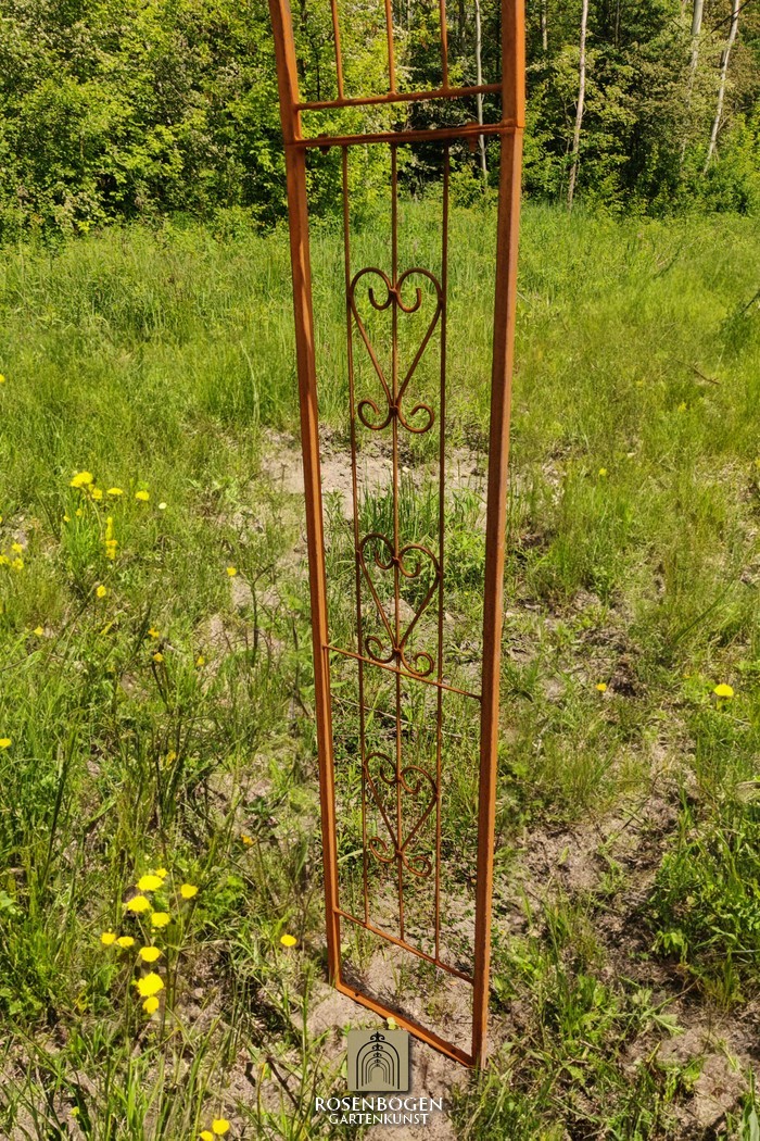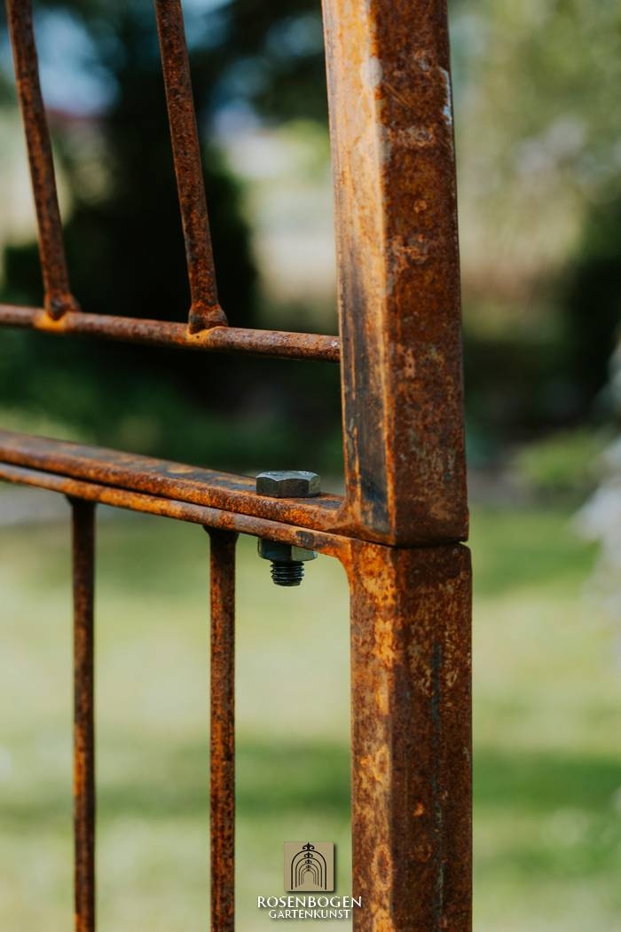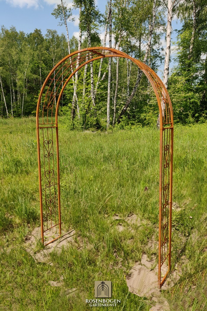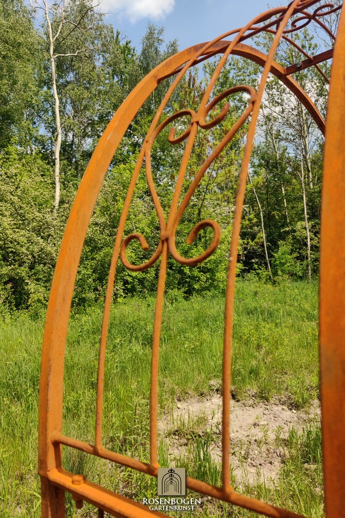 In this offer we would like to introduce you to the Garden arch Melanie . Its dimensions are H x 227 cm, W x 150 cm, D x 34 cm and the total weight is 22 kg. It is made of 20x4 mm flat bars, 20x20 steel profile and 5 mm steel rod