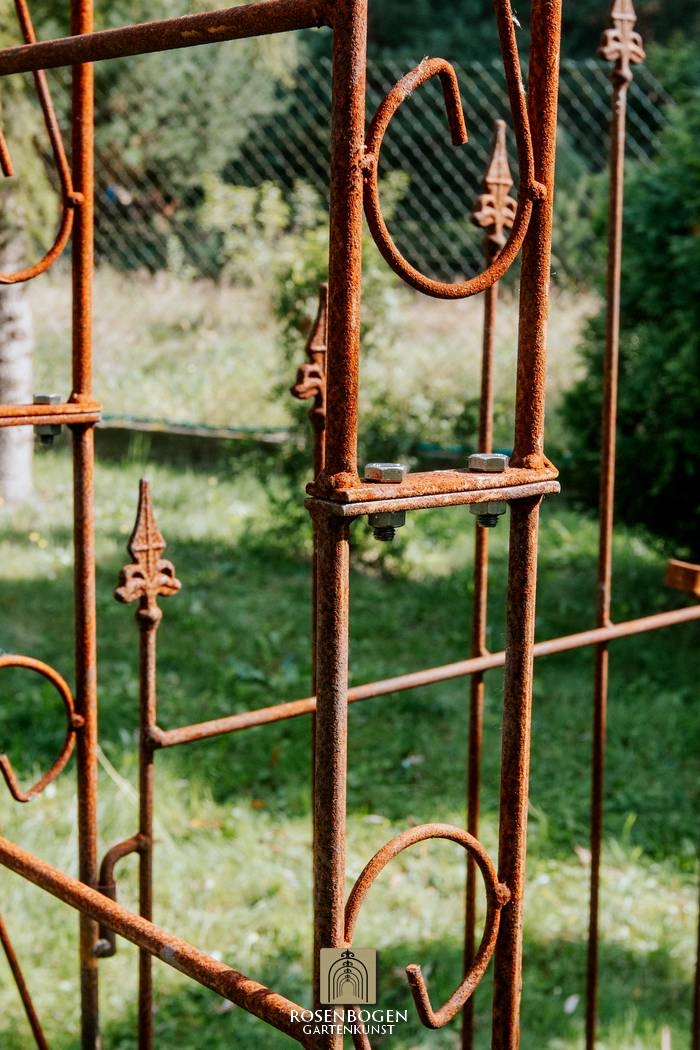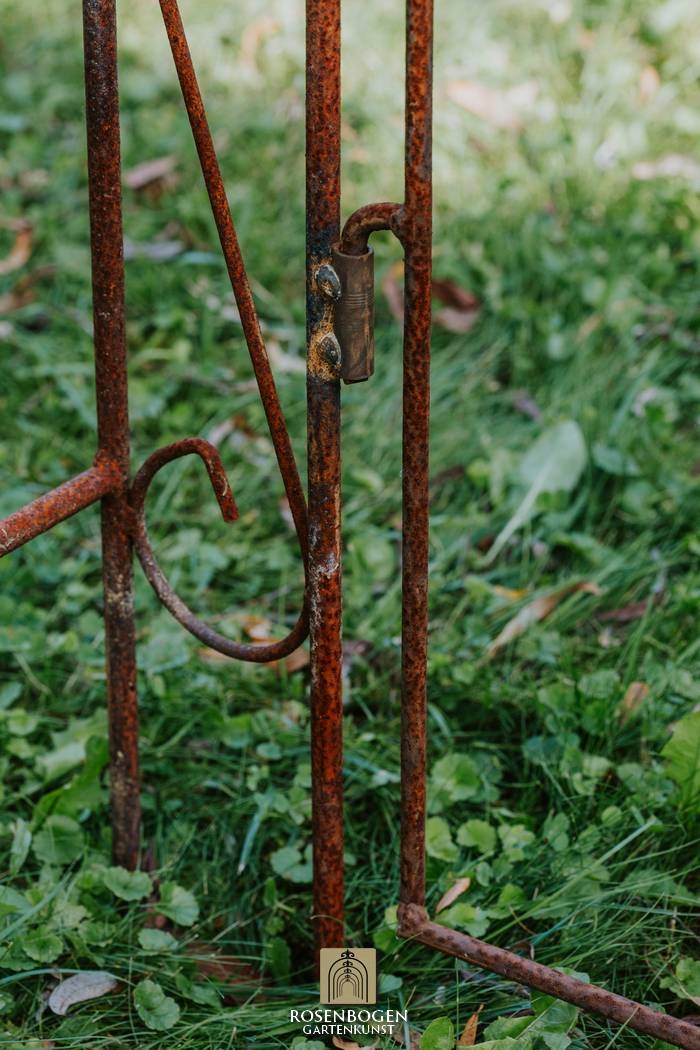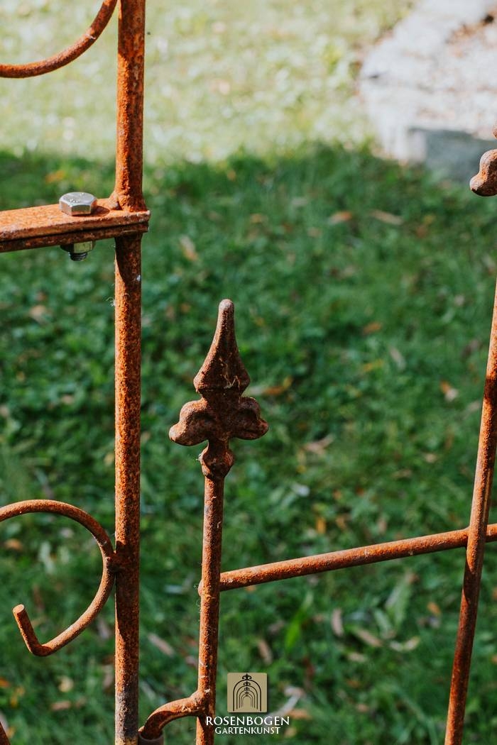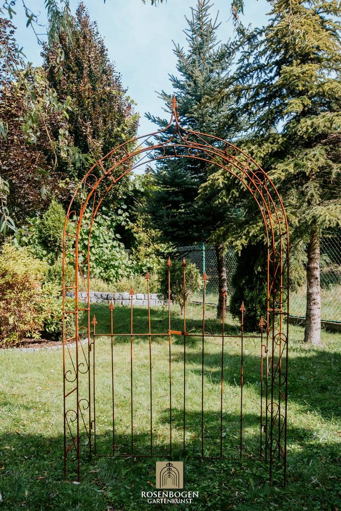 In this offer we would like to introduce you to the Garden arch Alex with gate top. Its dimensions are H x 250 cm, W x 140 cm, D x 33 cm and the total weight is 27 kg. It is made from 20x4 mm flat bars, 10 mm steel rod, 8 mm steel rod and 15 mm steel tube