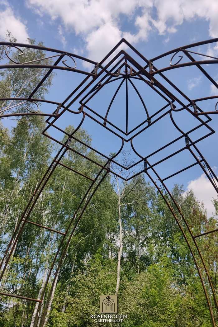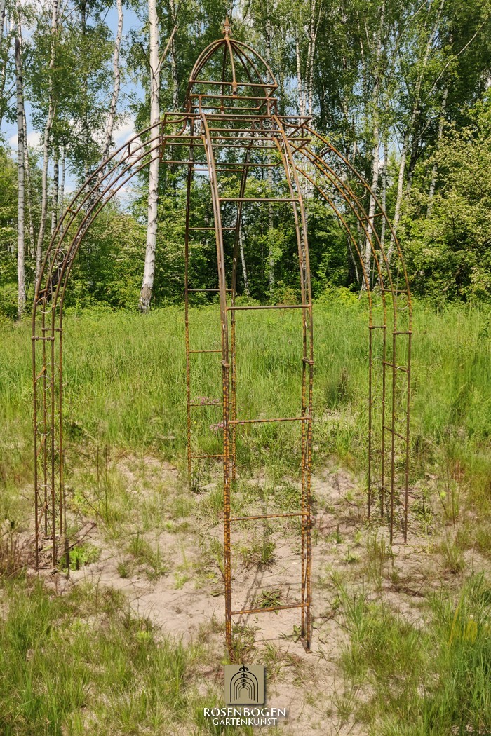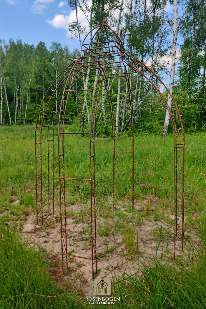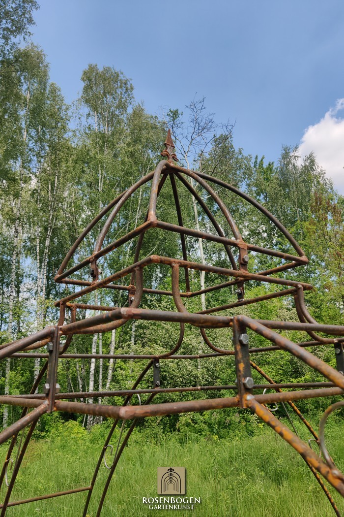Its dimensions are H x 300 cm, W x 200 cm, D x 200 cm and the total weight is 86.5 kg. It is made of 30x4 mm flat bars and 8 mm steel rod. It is also possible to make a gazebo that has 6 legs instead of 4.