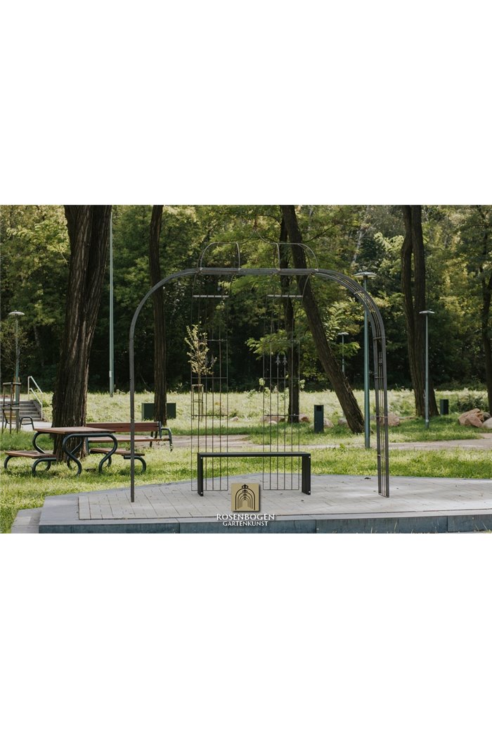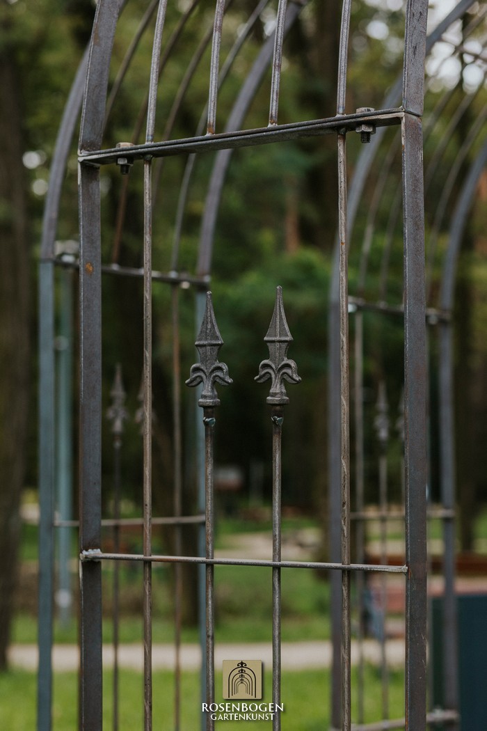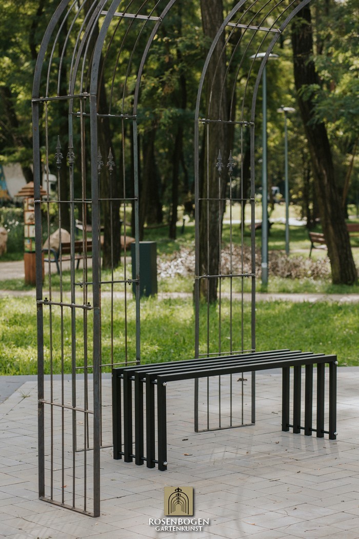Its dimensions are H x 290 cm, W x 110 cm, D x 260 cm and the total weight is 86.5 kg. It is made of 30x4 mm flat bars and 8 mm steel rod. It is also possible to make a gazebo that has 6 legs instead of 4.