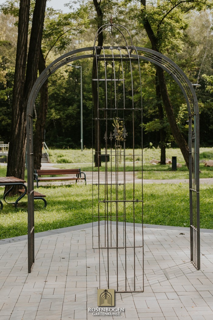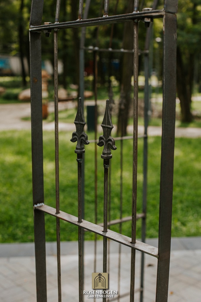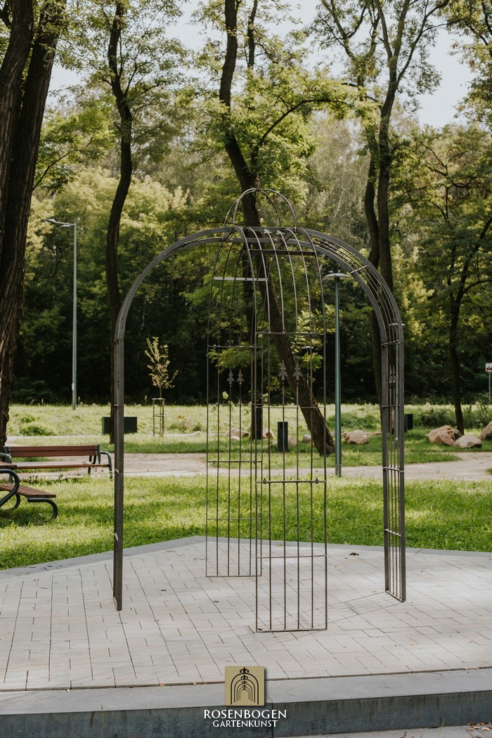 Its dimensions are H x 275 cm, W x 180 cm, D x 180 cm and the total weight is 86.5 kg. It is made of 30x4 mm flat bars and 8 mm steel rod. It is also possible to make a gazebo that has 6 legs instead of 4.